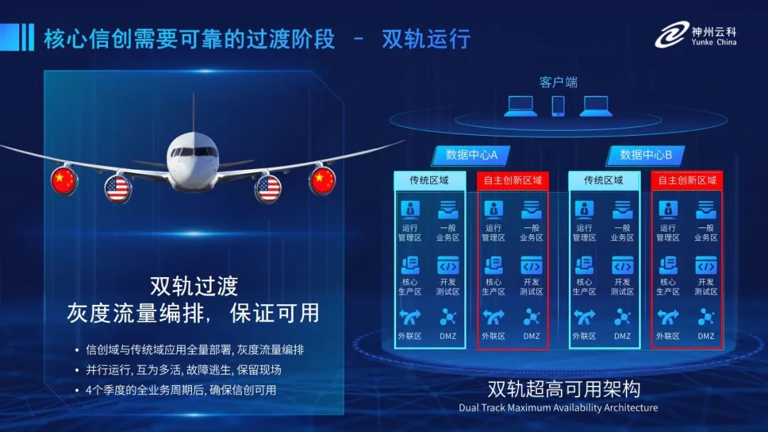 为帮助客户更好地应对数字经济时代对应用可持续性的高要求,实现信创与数字化兼得,米兰·(milan)中国推出了双轨超高可用架构。双轨超高可用架构在双活数据中心的分区调度基础上,增加信创域和非信创域的分域调度,实行信创域与传统域应用全量部署,使双中心运营变为双中心四区域并行运行,互为多活,将传统架构变为分区分域协同的多活双轨超高可用架构。帮助客户在新架构下,保障“信创”的同时解决性能瓶颈,提升稳定性,保证应用可持续性,最终实现信创区域和非信创区域的平滑过渡,完成国产化替代目标。”