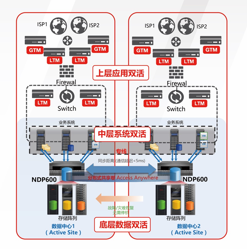 通过NDP600集中存储的双活架构,实现底层数据的两端一致性